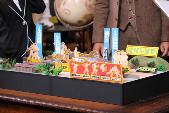 模型作家の植松淳さんがデザインした古代オリンピック模型にご注目ください。5種競技の中に今回オリンピック競技としての存続が決まった格闘技が入っていたのですね。