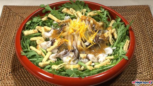 ⑤ ドレッシングの材料を小鍋に入れて、沸騰寸前まで火にかける。召し上がる直前に③に回しかけ、全体を混ぜ合わせる。④の柚子の果汁をしぼり回しかける。