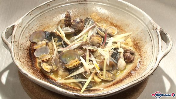② すずきを裏返したら、すぐに日本酒にハチミツみそを溶いて加える。あさりもと①で取り出したにんにくを加え、蓋をしてあさりの口が開くまで加熱する。