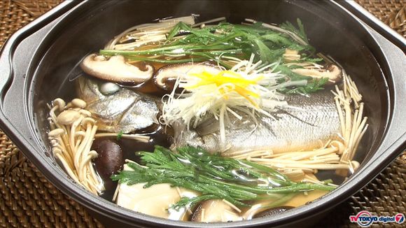 1、ラクッカーに昆布を敷きスズキを入れ、シイタケ、エノキ、豆腐も入れる。