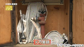 街の景観を壊さないように配慮された、渋い木箱に入った消火栓。消火栓は2、3軒の家に1個の割合で設置されている。宿場内、合計53個の消火栓と日頃からの人々の用心で古い町を守っている。