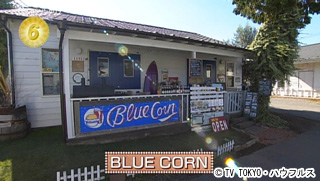 扉と看板がジョンソンブルーのアメリカンダイナー。ハンバーガーには、和牛の脂身を加えた100%のビーフパテを使用し、旨味濃厚。オリジナルのTシャツなども販売している。Tシャツのイラストを描いたのは、伝説のロックンロールペインター、ケリー岡田さん。オーナーと知り合いで、お店を気に入り、表の看板も手掛けてくれたという。ジョンソンタウンの景観に華を添えている。