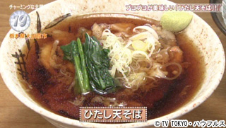 高級牛肉の産地として有名な栃木県大田原市。市民が愛するローカルフードが"ひたし天そば"。天ぷらを浮かべた温かいつゆと、冷たい蕎麦が別々で供される。出前の際、蕎麦が伸びないようにと、分けて運んだのが始まり。蕎麦をつゆに浸すから"ひたしそば"。つゆに入っている天ぷらが、次第に柔らかくなっていくのが良い感じ。北関東らしい濃いめのつゆがじゅわっと染みている。