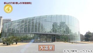 新宿御苑にある温室。ここで栽培される植物はおよそ2,700種類。新宿御苑発祥の洋ラン「レリア・シンジュク」など、変わった名前の植物も育てられている。