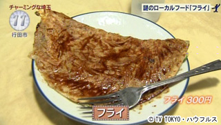 埼玉県北部の街でよく食べられるご当地グルメ。「フライ」とは、水で溶いた小麦粉の上に、豚肉やネギ、生卵などをトッピングして焼いたもの。名前は「フライ」だが油で揚げない。鍋の蓋で押さえながら焼いていく。かつては、フライパンで焼いていたため、「フライ」という名が付いたという。