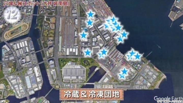 海外からコンテナでやってきた品々は、続いて巨大な冷蔵倉庫や冷凍倉庫へ。島に立ち並ぶこれらは、冷蔵&冷凍団地と呼ばれている。