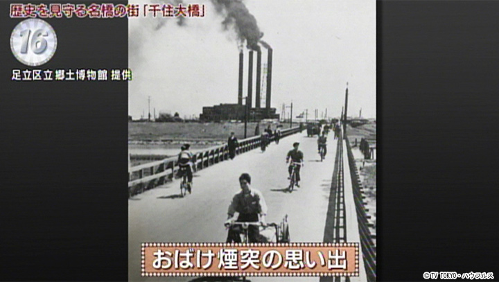 昭和39年まであった千住火力発電所の4本の煙突。隅田川沿いにそそり立つその姿は、街の象徴。見る場所、角度によって本数が変わることから、「おばけ煙突」の愛称で呼ばれた。今も地元の人の心に残る懐かしい風景。