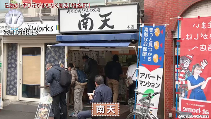 椎名町駅北口目の前にある立ち食いそば店。地元で愛されて22年。実はこちら、立ち食いそばファンが絶賛する東京屈指の名店。彼らのお目当ては最強と讃えられる”肉そば”。玉ねぎの甘さを生かしたツユで煮込んだ豚肉を、そばが見えないほどどっさりと。朝10時まではサービスで卵をトッピングしてくれる。