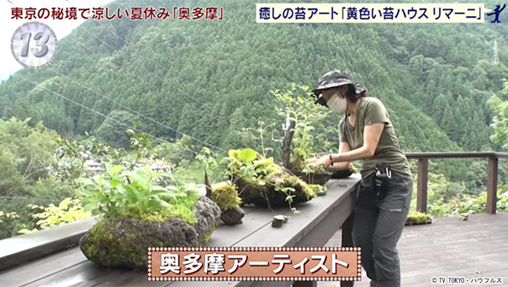 自宅の庭で苔を育て、そこから作品を生み出す苔アーティストの高瀬任子さん。湿度が高く、朝夕の寒暖差が大きい奥多摩は、苔にとっても最高の環境。