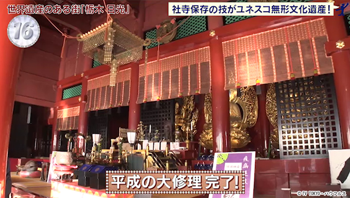 2020年12月、ユネスコ無形文化遺産に、日本の伝統建築物の修理や保全を行う匠の技の登録が決まった。その技術が、今回の修理に活かされました。輪王寺本堂では、柱の深刻な虫食いが発覚。傷んだ柱の内部だけを削り新たな芯材を入れることで古い柱を再生。修理には予定の4倍以上の時間を費やしたが、匠たちの技と熱意により、まばゆい姿を取り戻した。日光東照宮の「三猿」も、手入れ前は色が落ちてしまっていたが、創建時と同じ「岩絵の具」で彩色。先の修理の時の見取り図を元に塗り直された。
