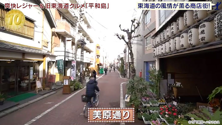 旧東海道の道幅を残す美原通りの商店街には、江戸の風情を感じる店々が並ぶ。
