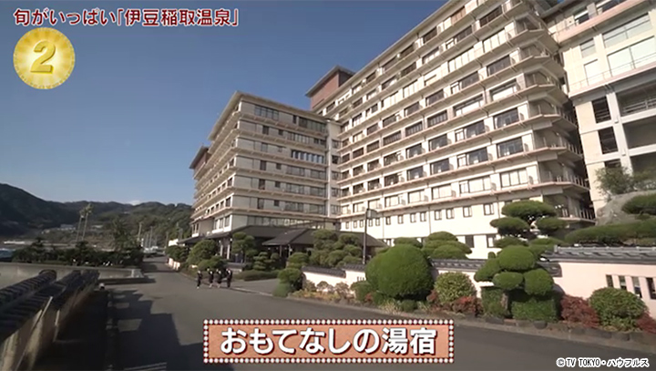 稲取随一の有名旅館。全国の旅行代理店がが選ぶ、日本のホテル・旅館ランキングでは、トップ5の常連。特におもてなし部門が高評価。そのおもてなしは送迎バスから始まり、運転手さんからホカホカのおしぼりが渡される。またチェックアウト後は、ホテル前まで出てきてお見送りもしてくれる。