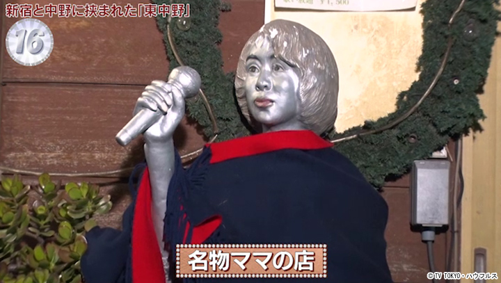 店先でマイクを握る女性の像が一際目を引くスナック。実は、ママの大ファンだという常連さんが30年ほど前に作ってくれたもの。ママを目当てに、毎夜常連さんが集っている。