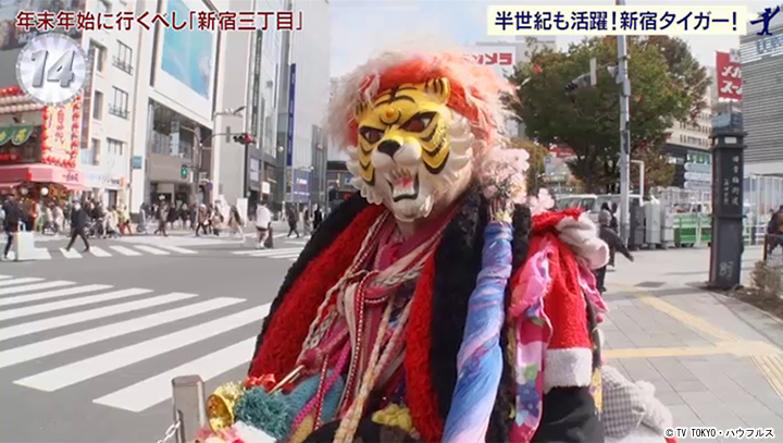 かつて新宿で派手な衣装に虎のお面を被り、自転車でパフォーマンスをしていた名物新聞配達員。今も虎のお面を被り活動中。御年74歳で、現在は配達ではなく、集金を担当している。新宿に半世紀いるタイガーさんは街中に友人がおり、歩けば声をかけられる人気者。