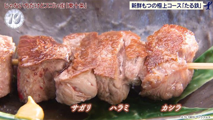 もつのコース料理が話題のお店。出汁がジュレ状になった塩もつ煮、串焼き、もつのハンバーグなど、ハイレベルな料理ばかりだが、コースと言っても、値段は1,500円と超激安。コースの後に頼みたいのが、「もつ鍋しゃぶしゃぶ風」。下味のついたもつをスープにくぐらせていただく。