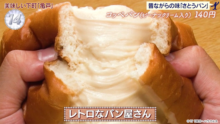 昭和36年創業。亀戸出身の持田香織さんも愛するパン屋さん。人気はコッペパン。注文が入るとジャムやピーナツクリームを熟練の技でたっぷりと塗ってくれる。