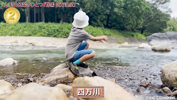 四万温泉を流れる清流。川の下からも温泉の源泉が湧き出している。四万温泉の入口にあるのが、川の流れの侵…