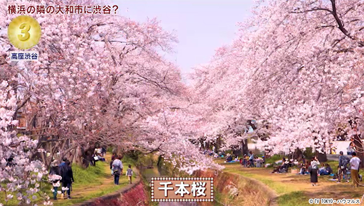 高座渋谷の春のシンボル。引地川沿い1.5kmの桜並木を見に、毎年約20万人が訪れる。川幅拡張工事のため、桜は消滅の危機にあったが、地元の桜を守る会の皆さんの活動により、美しい風景が守られている。