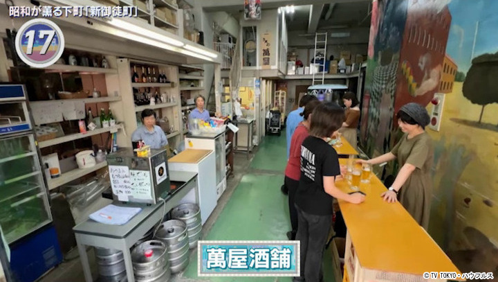 約100年続く酒屋さんがガレージを改装し、オープンした角打ち。東京藝大の学園祭用にビールを配達していた関係から、約40年前に藝大生が描いたという巨大な壁画が目を惹く。