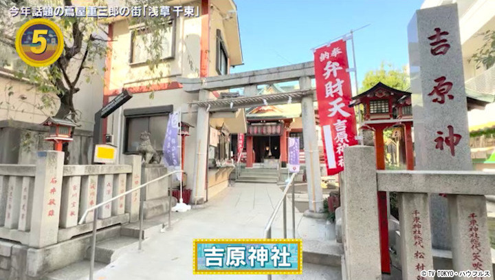 明治14年、吉原遊廓内にあった5つの神社を合祀して創建された。入り口にある「逢初桜」の先代は吉徳稲荷…