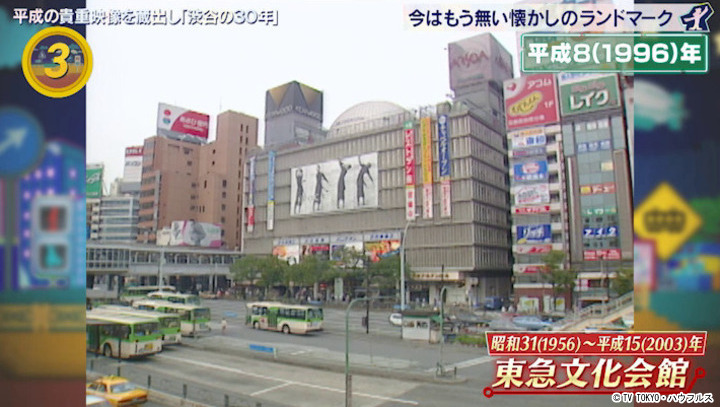 渋谷公会堂や東急百貨店本店、東急プラザ渋谷、かまぼこ型の屋根の東横線渋谷駅など、今では見られなくなったランドマークがたくさんある。