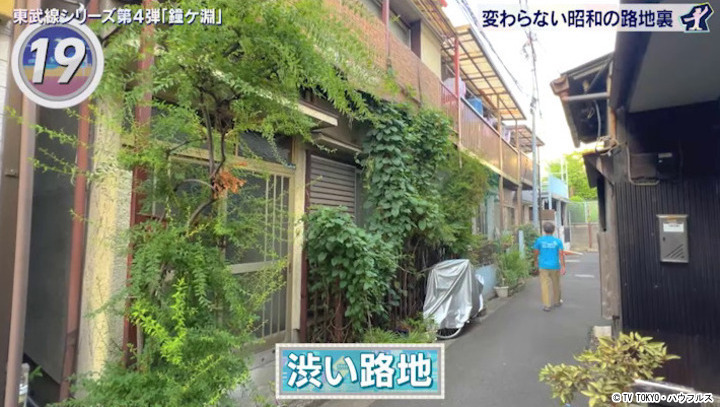 鐘ケ淵には、奇跡的に戦火を免れた場所が多く、今も昭和の懐かしい風景が随所に残っている。戦前の木製電柱や渋い長屋が現役で残り、まるでタイムスリップしたかのような光景が広がっている。