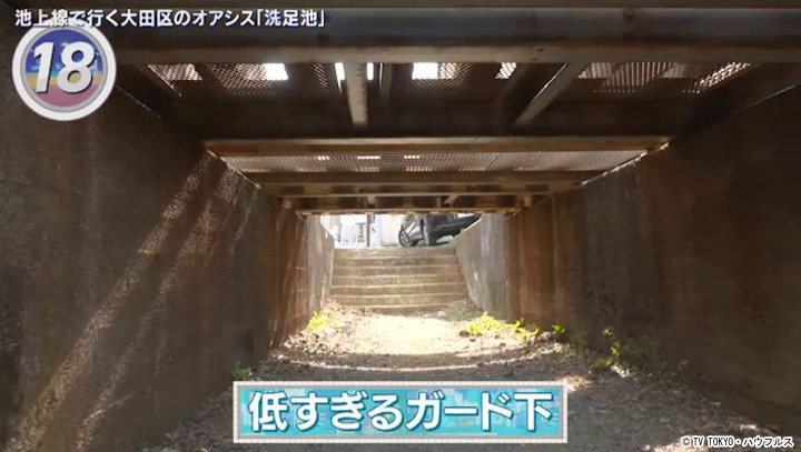 中原街道沿いにある東京一低いと噂のガード下。高さは145cmしかなく、すぐ頭上を池上線が通過する。