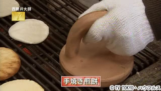 門前で大正年間から続く煎餅店。巧みにコテを使い一枚一枚手焼きしている。長さおよそ30cmの”厄除けダルマ煎餅”も販売。