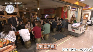 カニ料理が堪能できる居酒屋。店内のショーケースで、タラバ、ズワイ、毛ガニを量り売り。焼く、茹でるなど、好みの調理法で味わえる。名物は毎日2回開催されるカニの競り。高級カニを競りでお得に味わえる。食べ切れなければ持ち帰りもできる。