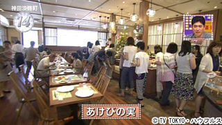 「お茶の水 ホテルジュラク」にある「百彩健美 あけびの実」は、とてもヘルシーなビュッフェレストラン。食と健康をテーマにした品々が、ランチならおよそ60種類楽しめて、1,620円。野菜は主に群馬県の契約農家で作られた低農薬の物を使用。カロリーを気にせず食べられる。”もずく”も”茶粥”もおかわりし放題。連日、奥様方が詰めかけている。