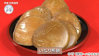 創業からおよそ80年を数えるいなり煎餅の有名店。3代目がリズミカルに手焼きする姿には、海外からの観光客も興味津々で、動画や写真をSNSにアップている。定番の丸型に加え、大きなキツネのお面型も人気。