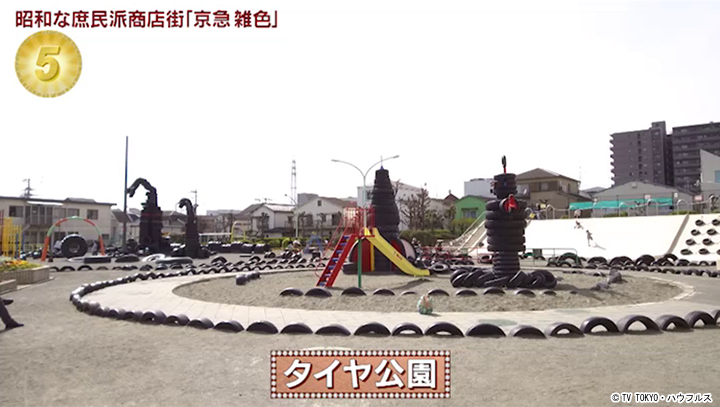 昭和44年に完成した古タイヤを活用した遊具のある公園。開園時、約3000本もの古タイヤを収集。懐かしいフォルムのロボットや、ゴジラ風の怪獣の遊具は開園当時からの人気者。