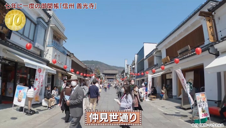 善光寺の仁王門の先に広がる参拝者に人気の通り。約50軒のお店が並ぶ中、信州の特産品を使ったスイーツ店が充実している。