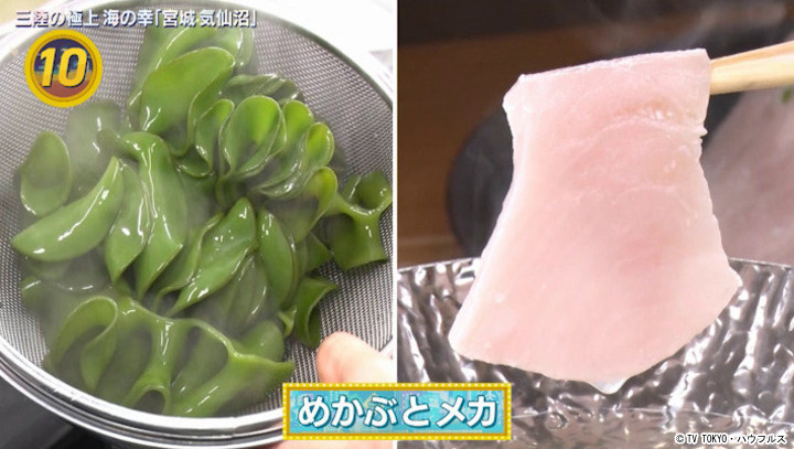 気仙沼の食卓に欠かせない海の幸。めかぶは、一般的には細かく刻まれたパック入りの姿が知られているが、気仙沼では丸ごとの状態で店頭に並ぶ。新鮮なめかぶは。歯ごたえと旨味が別格の味わい。また、地元では「メカ」の愛称で親しまれるメカジキは気仙沼がシェア日本一。通年で水揚げされ地元民に広く愛されている。