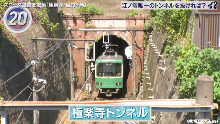 長谷駅と極楽寺駅の間にある江ノ電唯一のトンネル。明治40年に竣工し、全て人力で掘られた。明治43年に江ノ電は全線開通し、湘南エリアの観光客が増加した。