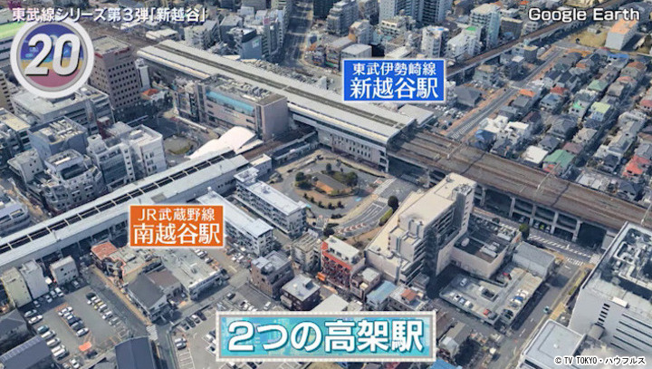 東武伊勢崎線の新越谷駅とJR武蔵野線の南越谷駅がどちらも高架でクロスする珍しいスポット。駅周辺の利便性を高めるため、1994年に伊勢崎線の高架化により新越谷駅は、すでに高架だった武蔵野線を跨ぐ形でさらに高くなった。