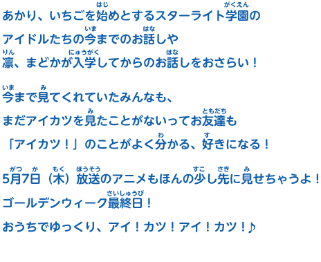 あかり、いちごを始めとするスターライト学園のアイドルたちの今までのお話しや、凛、まどかが入学してからのお話しをおさらい!