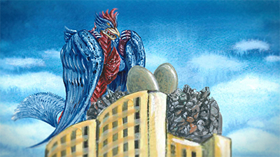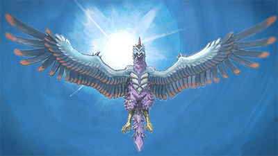 監視対象No.219「鳥龍テュルビュラースン」について、ケニー御子柴博士より報告。極東地域の都市の高層ビルの上に突如鳥の巣のようなものが形成され、巣にあった卵が怪しい光を帯び始め…。