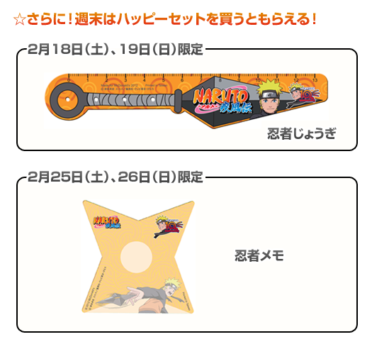 2012年2月17日(金)からマクドナルドのハッピーセットで「NARUTO-ナルト- 疾風伝」グッズが期間限定で登場するぞ!