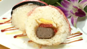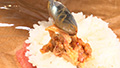 ④スパムカツをのせ、さらに具の上にごはんをのせる。