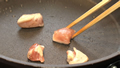 ①カットしたとり肉をフライパンで炒め、こしょうで味付けする。