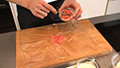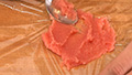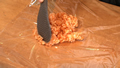 ⑤ラップを敷き、その上に赤い部分が下になるようにカニカマを敷く。