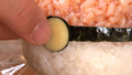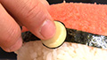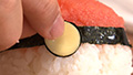 ⑩細長く切ったのりを、カニカマとご飯の境界線に巻き、