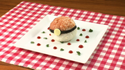 ⑦ご飯の中央に目玉焼き、ミニトマトのスライス、ミートボールの順に重ねて置く。