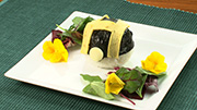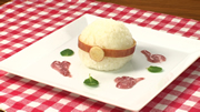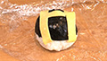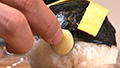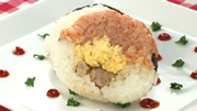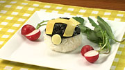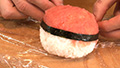 ⑥H型に切ったうす焼きたまごを握ったおにぎりの上にのせる。