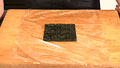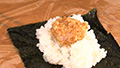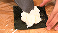 ③ラップの上にのりを敷き、ごはん160gをのせる。
