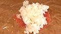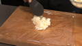 ⑥炊き上がったご飯を適量、敷いたラップの上に広げる。