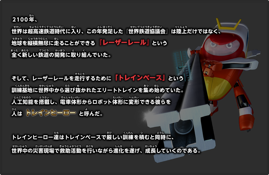 2100年、世界は超高速鉄道時代に入り、この年発足した『世界鉄道協議会』は陸上だけではなく、地球を縦横無尽に走ることができる『レーザーレール』という全く新しい鉄道の開発に取り組んでいた。
