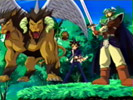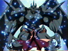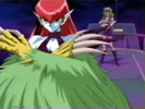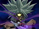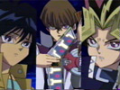 | 「闇のマリク」と「闇の獏良」のデュエルが続く。獏良は最強の力を持つ神のカード『ラーの翼神竜』を召還し、マリクを倒そうとする。しかしそれはマリクのワナにはまることを意味していた。マリクはワナカード『歓喜の断末魔』を発動。このカードの効果によって獏良がいけにえにしたモンスターの攻撃力がマリクのライフポイントに加算され、一方獏良の『ラーの翼神竜』の攻撃力は0にされてしまう。ピンチになった獏良は、ラーをあきらめ、自分のライフポイントと引きかえに墓地からモンスターを召還して巻き返そうとするが…。 |
