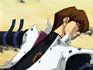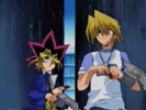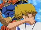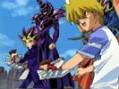 追いつめられた城之内はデッキマスター「炎の剣士」を召喚、後を遊戯にたくす。遊戯もデッキマスター「ブラック・マジシャン」を召喚。自分たちもデッキマスターを融合し、「黒炎の騎士 ブラック・フレア・ナイト」を召喚する。このモンスターは攻撃力2200。これで攻撃することは自殺行為に見えたが…。 |